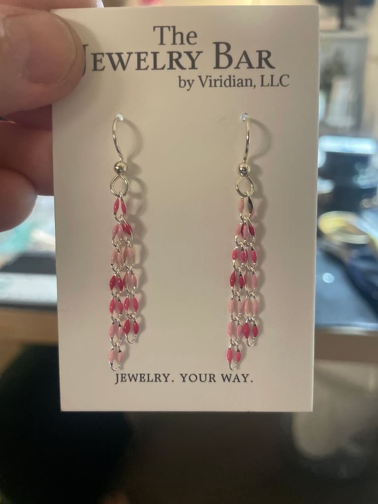 Gold plated and enamel chain earrings. Gold filled earwires; gold-plated chain component; 2.5” dangles. Silicone earbacks.
