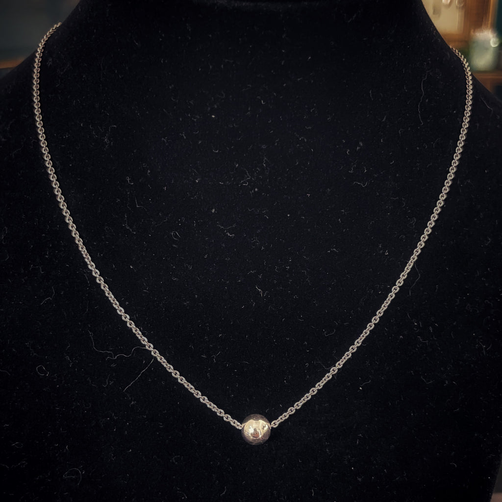 7 mm sterling silver seamless bead strung on a 1.5mm rhodium-plated sterling silver cable chain. (Rhodium-plating is a premium treatment applied to silver to help ensure durability and tarnish-resistance.)