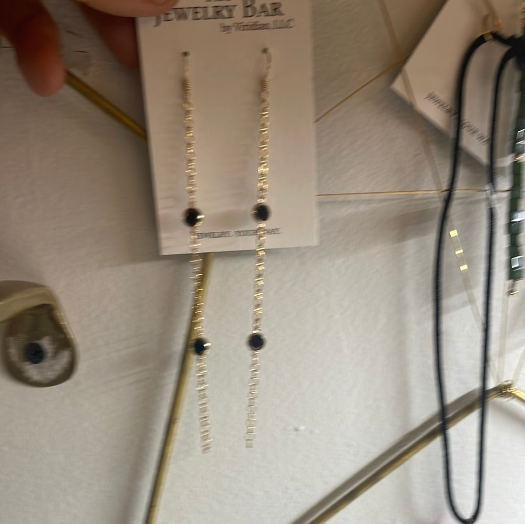 Gold-filled and black CZ shoulder duster earrings. 4 1/2” drop.